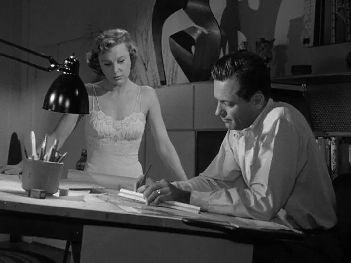 The Eames were consultants for the 1953 movie The Moon is Blue which is practically a product placement exercise for Eames furniture! The film centers around an architect (played by William Holden) who’s dashing apartment contains a Saarinen womb chair (Saarinen and Charles Eames collaborated a great deal whilst studying at Cranbrook), several Eames Wire Chairs and a Noguchi Coffee Table. Interestingly, even the star of the film, Maggie McNamara looks remarkably like Ray Eames.