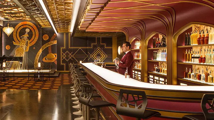 In an interview with The Hollywood Reporter production designer Dyas says of the bar he built at Pinewood Atlanta Studios: “What is the classic type of bar you would want to go to on Earth? It’s a New York art deco bar for me. Then there are little details that remind you that you are on a spaceship. The walls have art deco friezes, but unlike traditional friezes that showed the industrial age, ours show interplanetary travel.