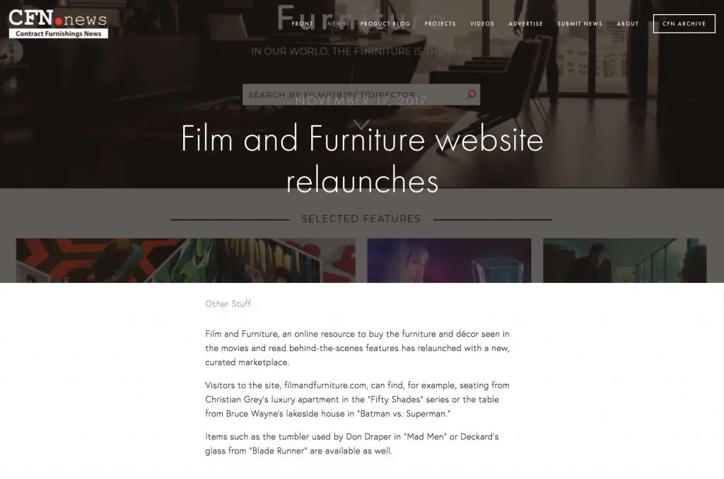 CFN (Contract Furniture News) says “Film and Furniture is an online resource to buy the furniture and decor seen in the movies and read behind-the-scenes features”.