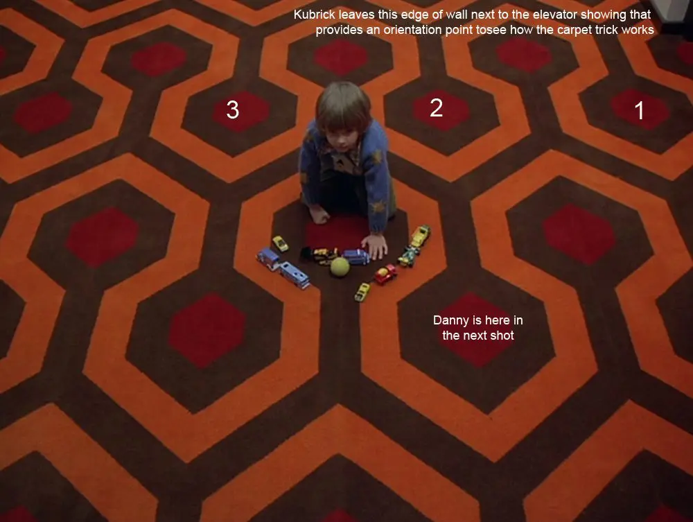 One of our favourite Kubrick analysts, Juli Kearns discusses on Idyllpus Press in ‘How the Kubrick Carpet Trick Works‘ how Danny’s position on the carpet in The Shining changes from shot to shot which she believes was a deliberate decision by Kubrick, comparing it to a chess move which also has a connection to the chess game between HAL and Frank Poole in 2001: A Space Odyssey.