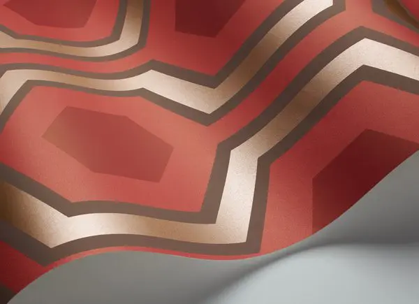 The geometric hexagon pattern large-scale print comes in six new colour ways including reds, sapphire blues, turquoise, ebony and copper. Hicks Grand is closer in scale to The Shining carpet and is available at around £126 per roll from Wallpaper Direct.