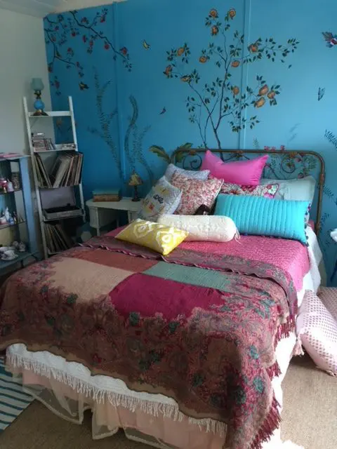 And what of that fantastic floral wallpaper creating a statement wall behind her bed? It turns out not to be wallpaper at all but a hand painted mural: “We decided that she would have painted the magical wall mural herself and surrounded herself with furniture and items that all made an emotional impression on her and brought beauty to her world”.