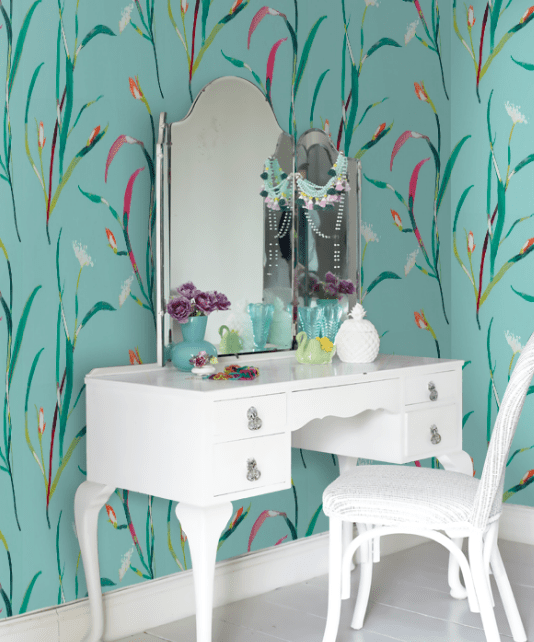 Floral murals such as Lara Jean’s are often influenced by the art of chinoiserie (from ‘chinois’ – the French for Chinese) which refers to a style inspired by art and design from China, Japan and other Asian countries. Usually painted by hand, Chinoiserie first became popular in the 18th Century. This style of wall covering is painted onto paper or silk and often depicts trees, flowers, insects and birds. These craft-led, labour-intensive works often come with a very high price tag.