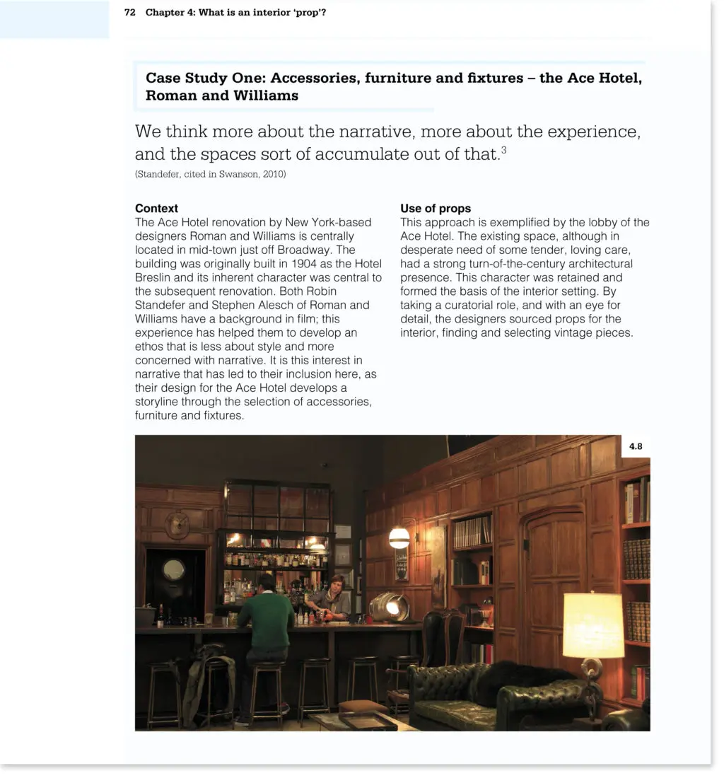 It is apparent that an interior mise-en-scène considers and prioritizes atmospheric storytelling through its use of scenery and props, an approach that can easily be applied to the work of interior designers. The design schemes of Roman and Williams (both of whom have an early career relationship with film) utilize storytelling in the creation of carefully ‘curated’ scenes that employs both salvage and bespoke furniture as props. The aim is the creation of a fictional history and back story for the newly renovated interior of the Ace Hotel, New York.