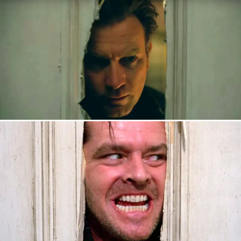 Jack Torrance’s head poking through the axe-splintered door announcing “Here’s Johnny!” is a scene etched on most cinema-goers memories. And here it is referenced in Doctor Sleep with Danny Torrance as a grown man. The trailer would imply that Danny goes back to visit the Overlook Hotel in Doctor Sleep.