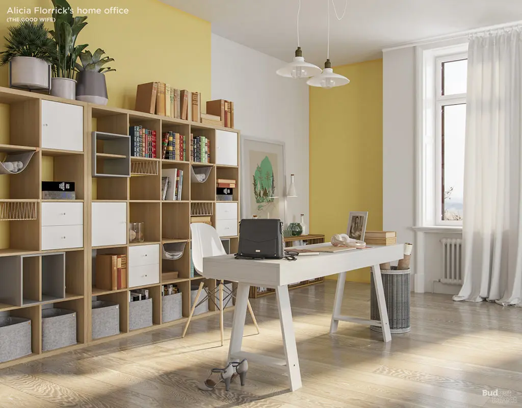Alicia’s apartment in The Good Wife was set decorator Beth Kushnick’s pride and joy, with much of it echoing her own home. “The palette is near and dear to my heart,” she told Parade. “Her bedroom is my bedroom colour, Beach Glass by Benjamin Moore.” But it was the study where the serious business took place, as reflected in that heavy old desk and sober blue walls. So very 2012. Today’s designers have revived the space with a trendy shade of yellow, and light, eco-friendly Scandi-chic furniture made from reclaimed materials.