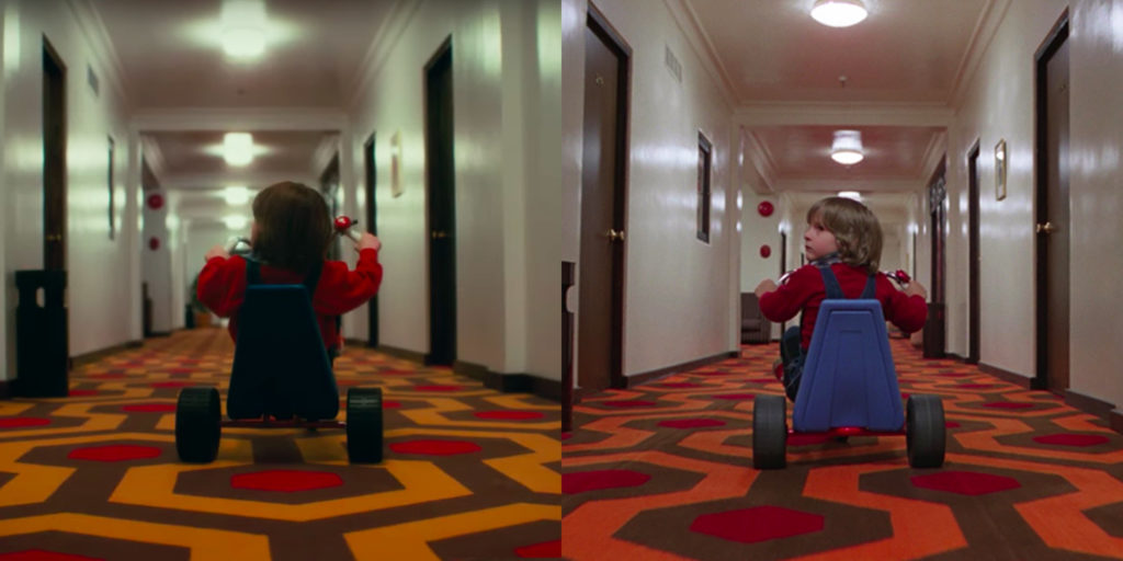 Doctor Sleep director Mike Flanagan carefully reconstructed the spaces, production design and set decoration of Kubrick’s Overlook Hotel. The film even opens with Danny riding around the corridors on his tricycle over the carpet’s hexagons.