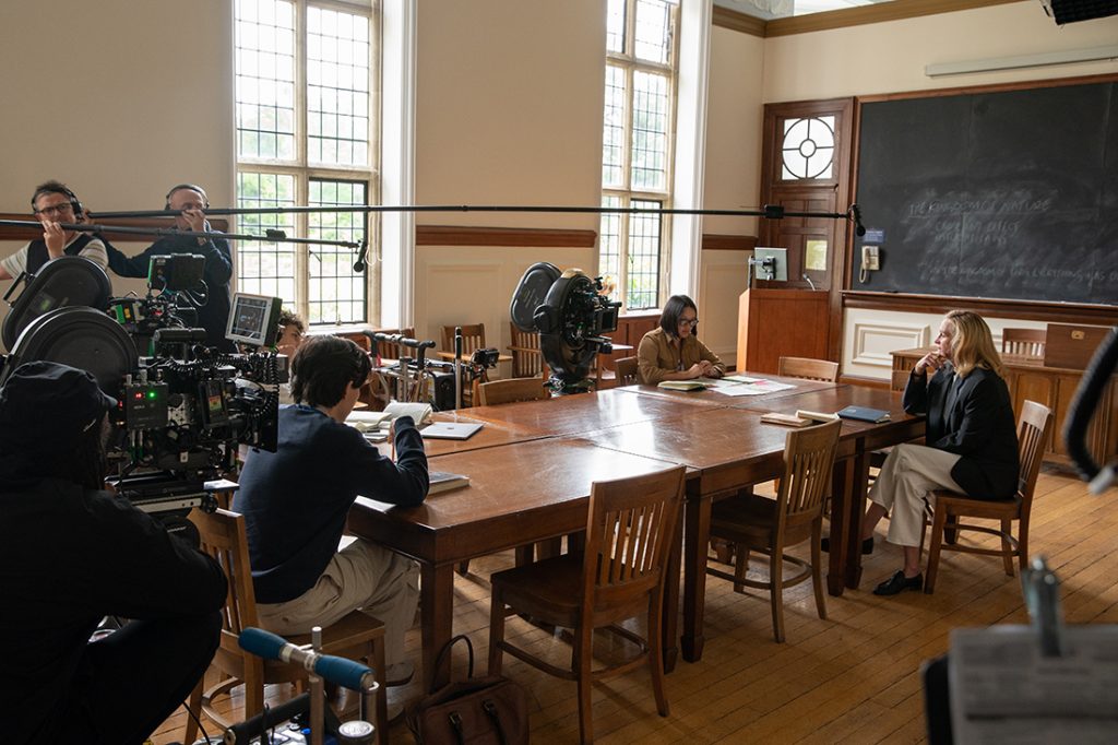 Although the story is set at the New Haven–based university, almost everything was built from scratch at Shepperton Studios in the UK, with a few brief exteriors filmed at Cambridge University. Baisi says the intention was “not literal geography but institutional psychology” — to build the idea of Yale, not a postcard replica of it. Yale becomes a structure of performance, not a backdrop: stone as certainty, heritage as armour.