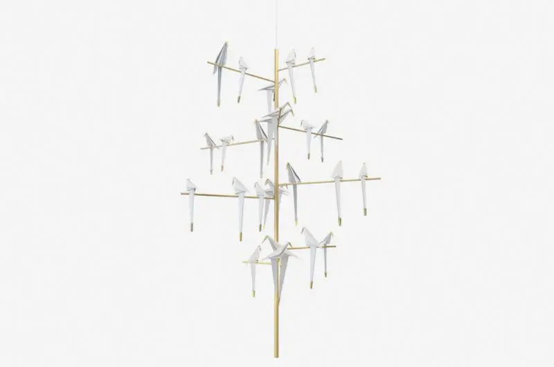 Umut Yamac’s Perch Tree Pendant Light turns light into movement. Perched birds, folded like origami, sway gently on their brass branches.