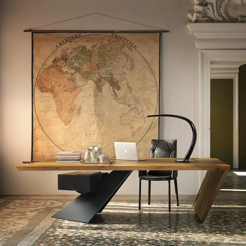 The simple yet eloquent lines of the Nasdaq table draw out an inverted rhombus shape from the slanting legs and drawers below the desk surface. Made of solid oak or Canaletto Walnut, the Nasdaq table fits the atmosphere of a modern home office. The two drawers are as designed jointly with beauty and utility in mind, allowing this desk to be enjoyed everyday, while in use and from afar.