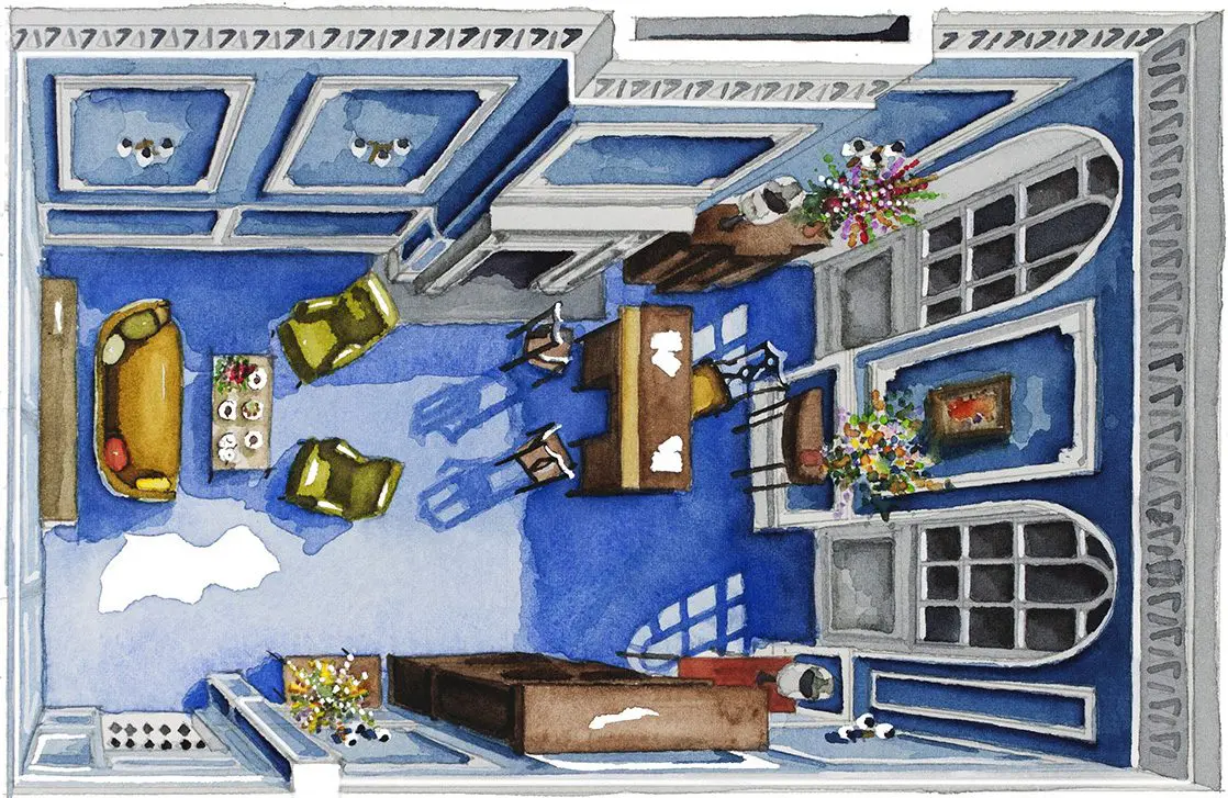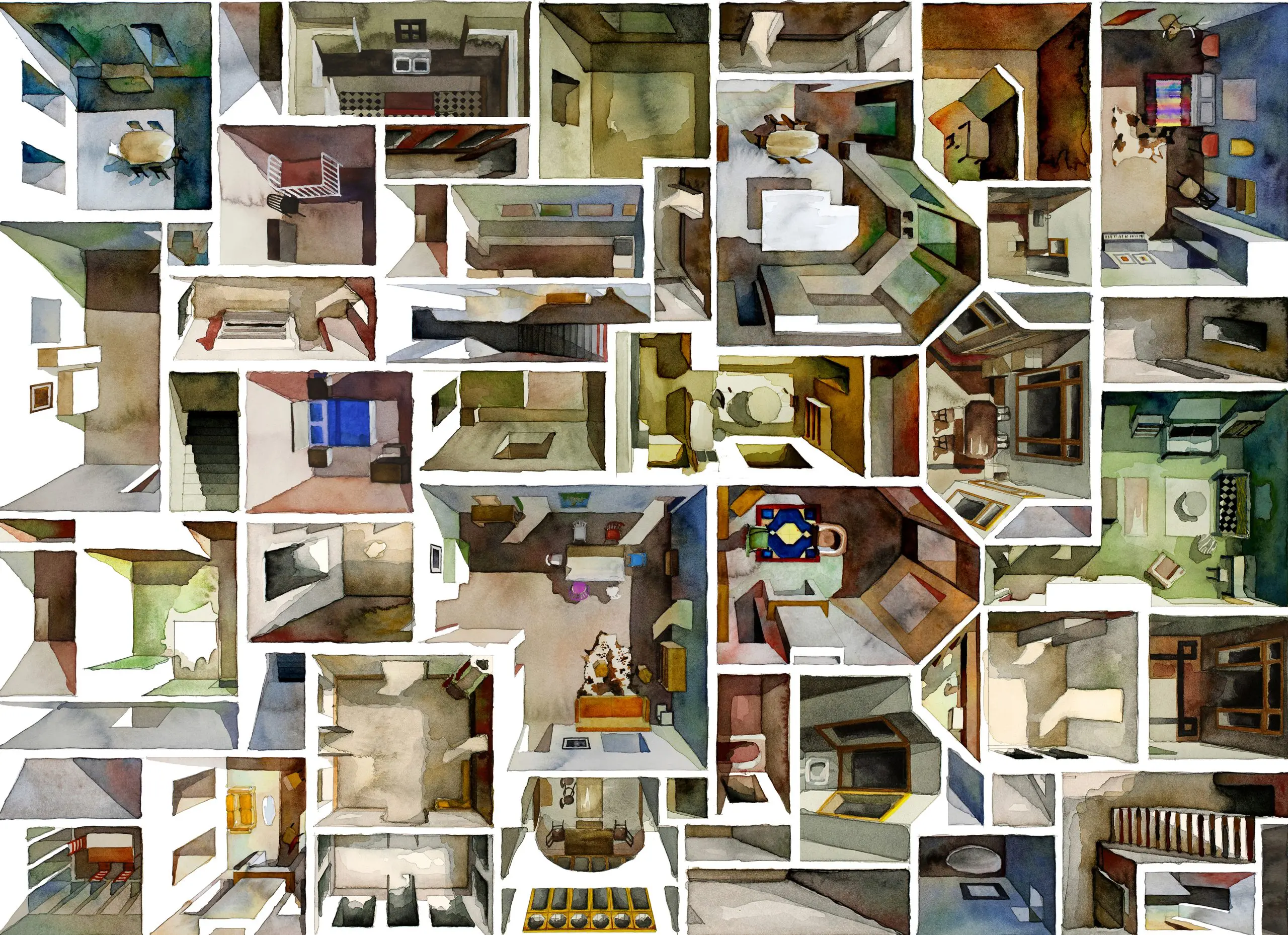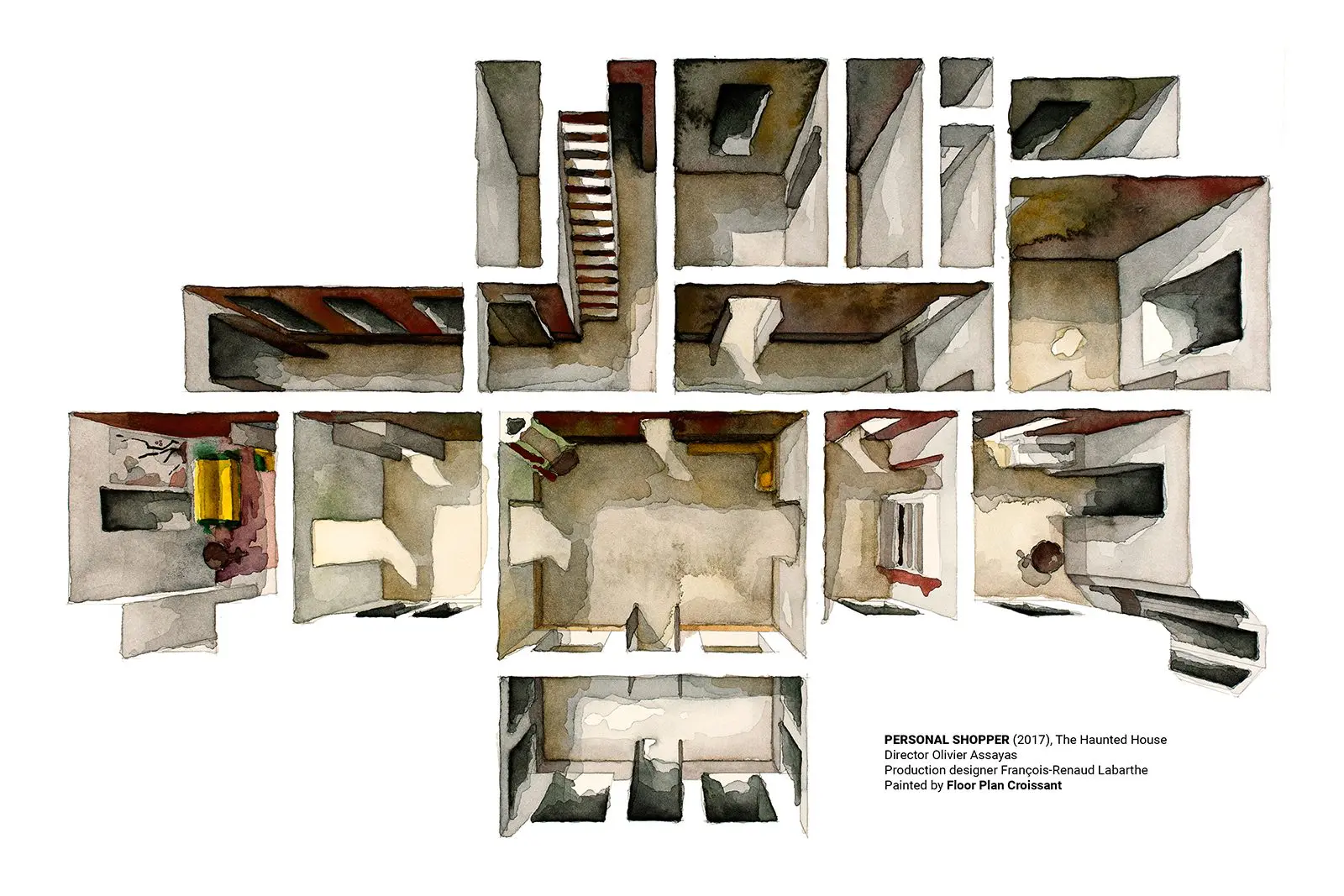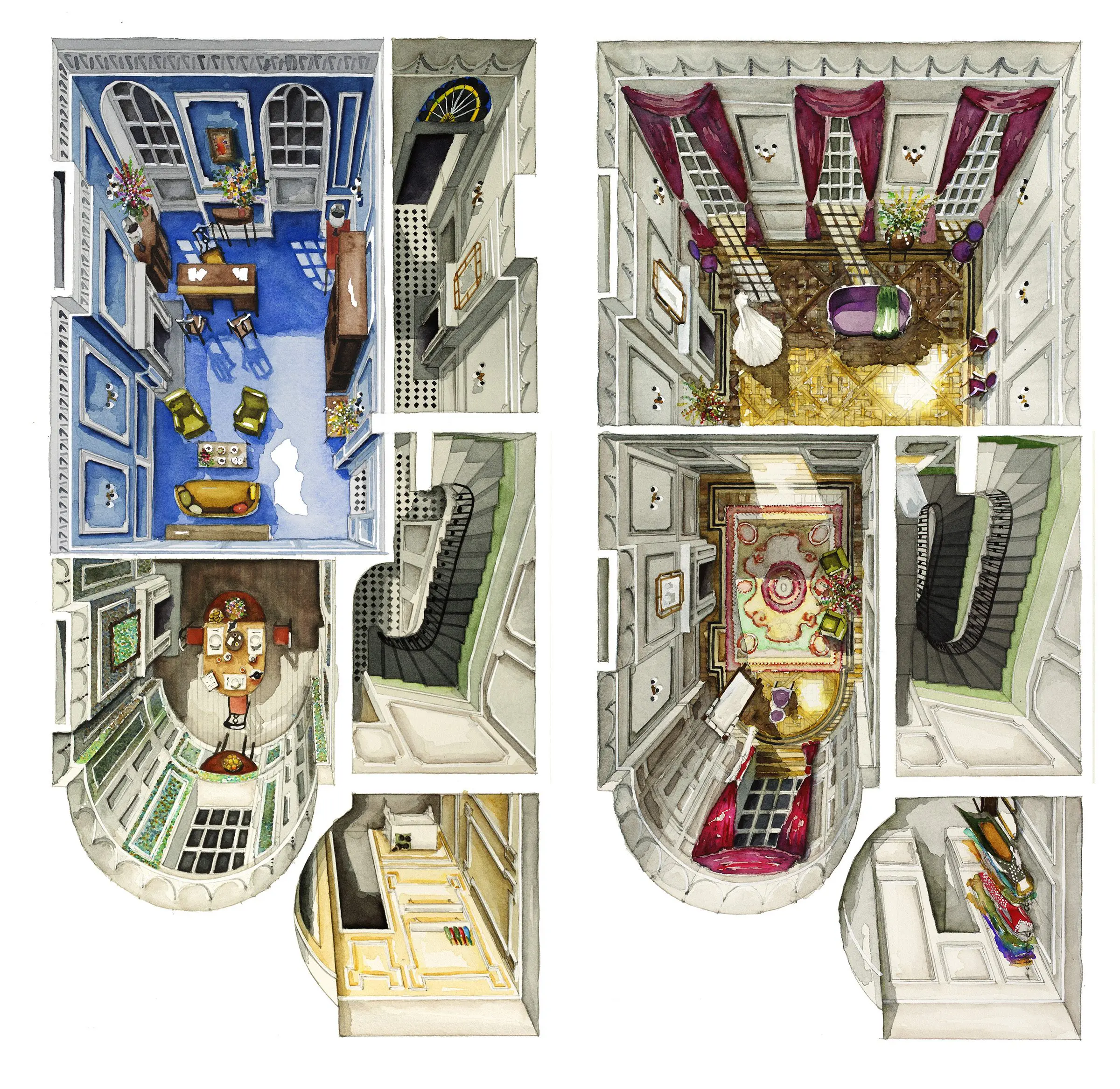 Floor Plan Croissant painstakingly recreates the floor plans and set decoration of film sets from famous movies and TV series in watercolour paint.