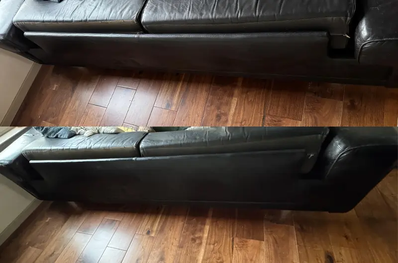 Original leather on majority of sofa: seat cushions had inner foam and leather upholstery replaced in 2014, arms and back cushions are original leather with new inner foam replaced in 2014.