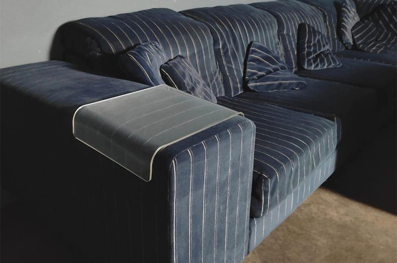 The sofa itself sits on a black wooden plinth box which hides its castors and creates a shadow gap to give the illusion of the sofa floating above the ground.