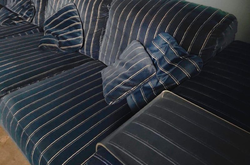 This desirable sofa set is upholstered in its original blue pin stripe velvet velour fabric, which has been professionally deep cleaned and restored to perfect condition.