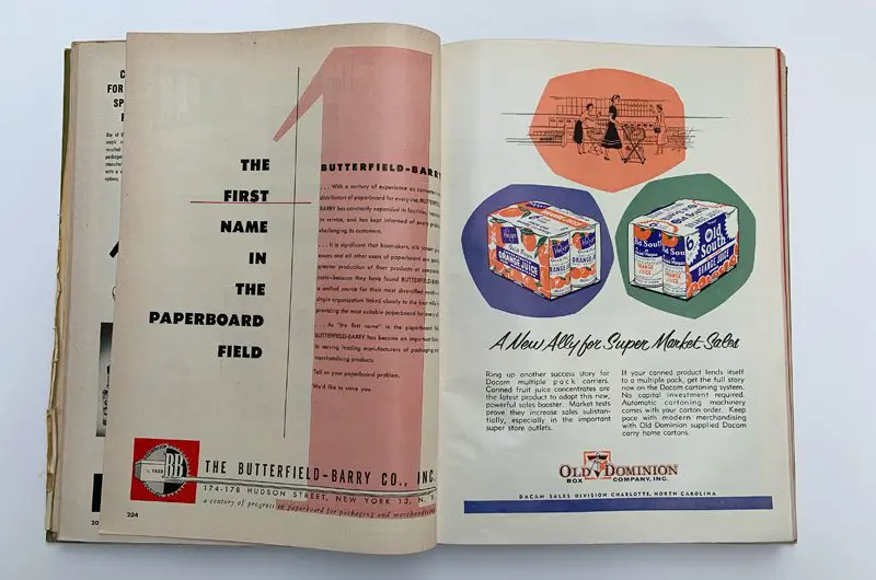 Used: A stunning book from 1954 documenting different types of packaging and materials available at the time and packed full of incredible adverts from packaging companies including tip-in pages and fold outs.
