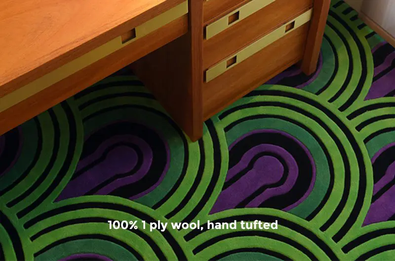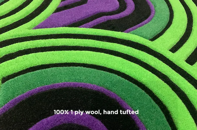• High-Quality Craftsmanship: Our highest quality version of this carpet is hand tufted and made from 100% 1-ply wool, ensuring durability and a luxurious feel underfoot. Subtle wool ‘carving’ around the black curves ensure a crisp line