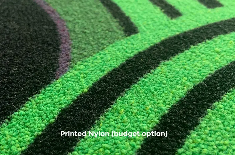 Digitally printed on nylon. This is a budget option. Hardwearing and suitable for domestic and commercial spaces.