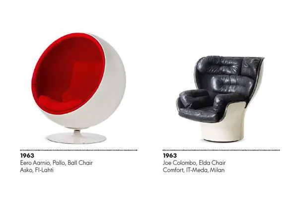 Designers: Charles and Ray Eames, Alvar Aalto, Arne Jacobsen, Charles Rennie Mackintosh, Eero Aarnio, Eero Saarinen, Eileen Gray, Gaetano Pesce, Geoffrey Harcourt, Hans J Wegner, Harry Bertoia, Jorge Ferrari Hardoy, Marc Newson, Marcel Breuer, Mario Bellini, Michael Thonet, Mies Van der Rohe, Richard Meier, Robin Day, Steen Ostergaard, Verner Panton, Warren Platner