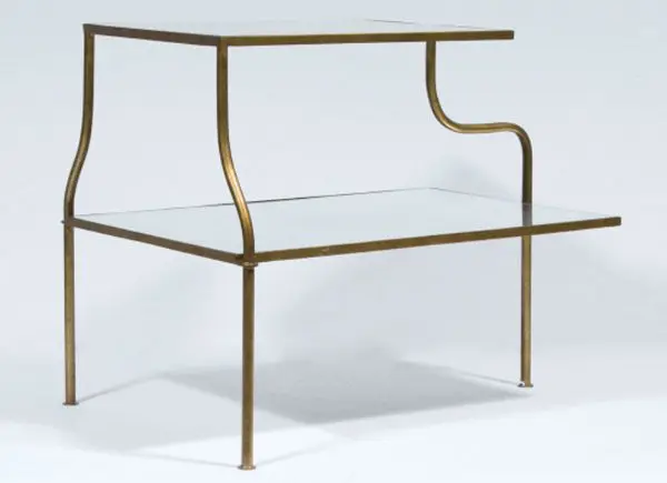 The Toulouse side table is a pretty 3-legged 2-tier bedside or sofa table available with a gilded frame and Eglomise top or, as the side tables in Anatomy of a Scandal – clad in a pebble grain black leather with saddle-stitched detail with brass accents and aged mirror top.